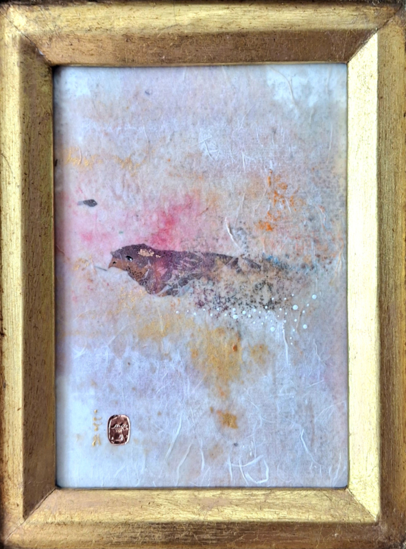 Op handgeschept papier en opgebouwd uit allerlei pixels van kleur en koper.
