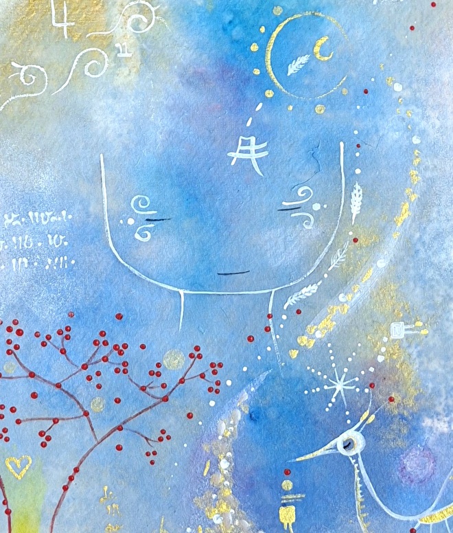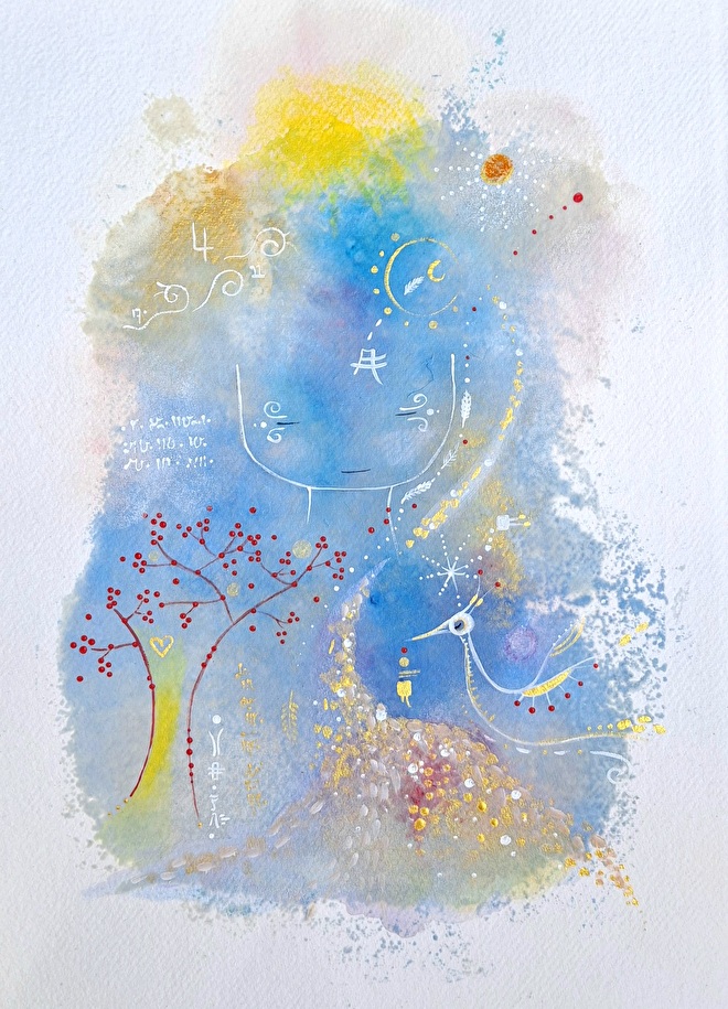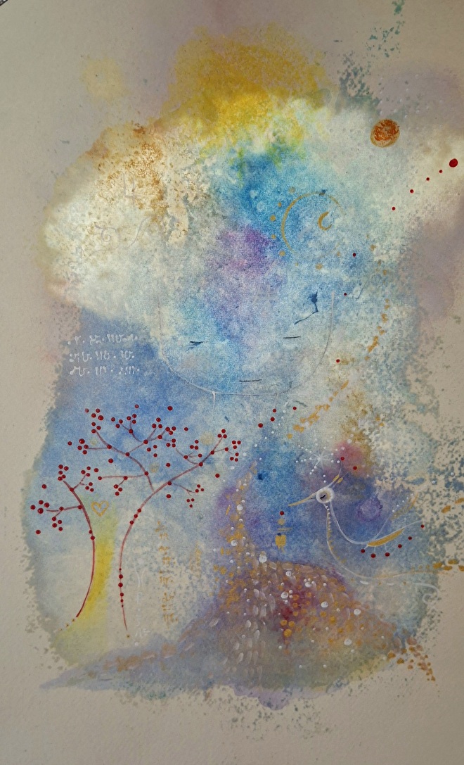 Hierin start ik vanuit iemands Levenslicht en wat zich daar in het NU zal tonen in bestemming, kleuren en wat NU belangrijk is, vertaal ik via beeld en taal.