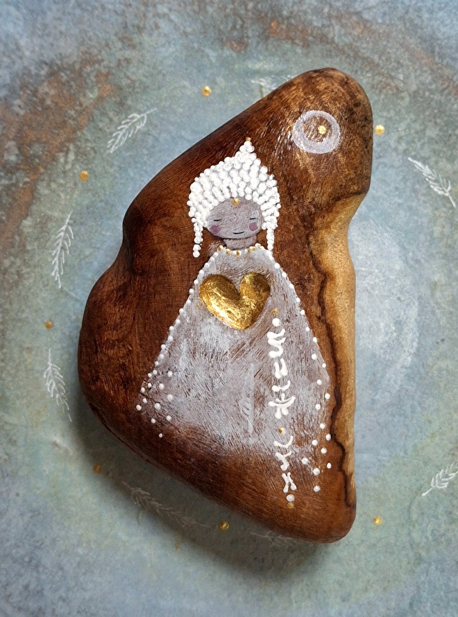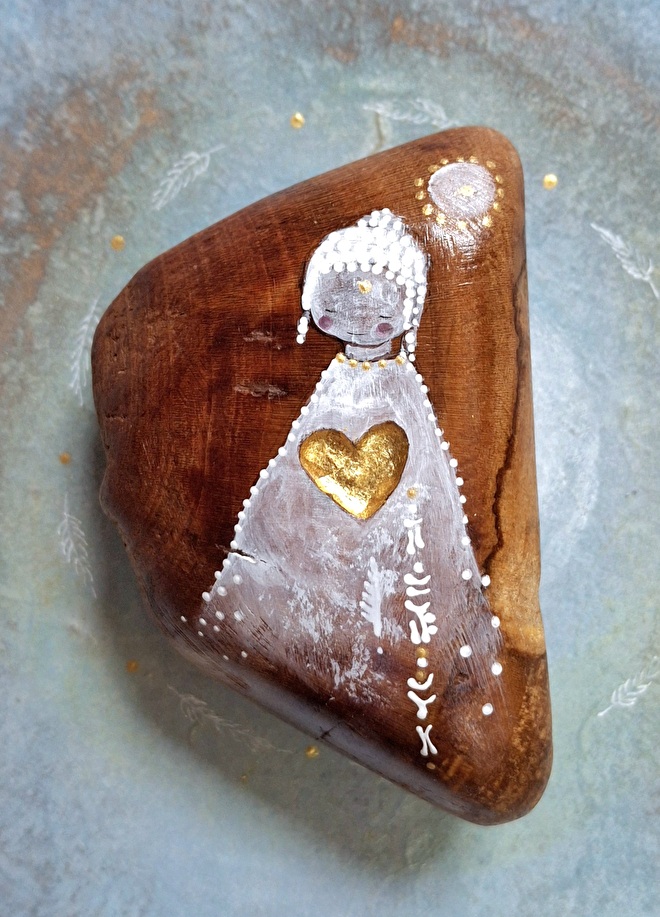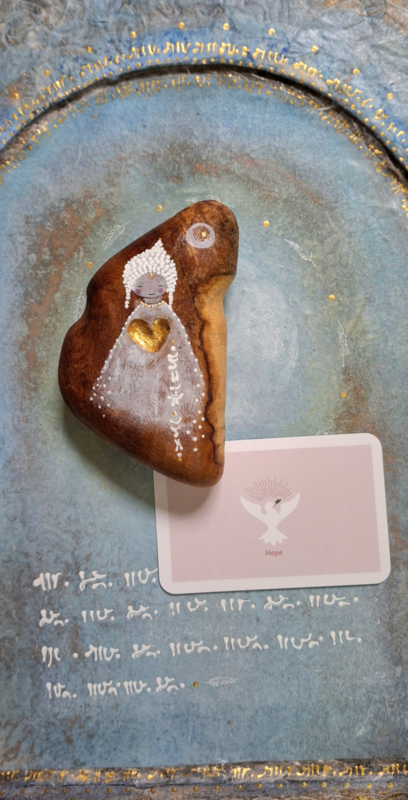 Maar de basis van Het Hart met bijenwas, bladgoud en daaromheen de Witte Vredes Dame, zullen op elk van mijn handgemaakte Lichtfladderaar Vredes Harten aanwezig zijn.